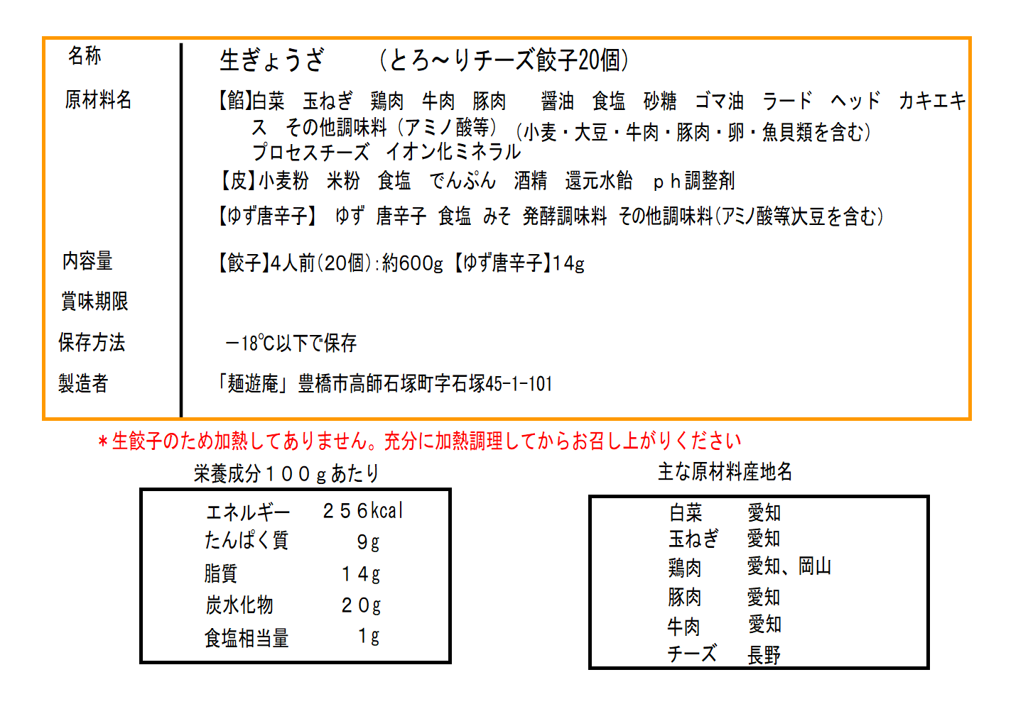 生餃子の冷凍になります。必ず冷凍保存して、冷凍のまま調理してください。(解凍すると品質がいちじるしく低下します。絶対に解凍しないで下さい)