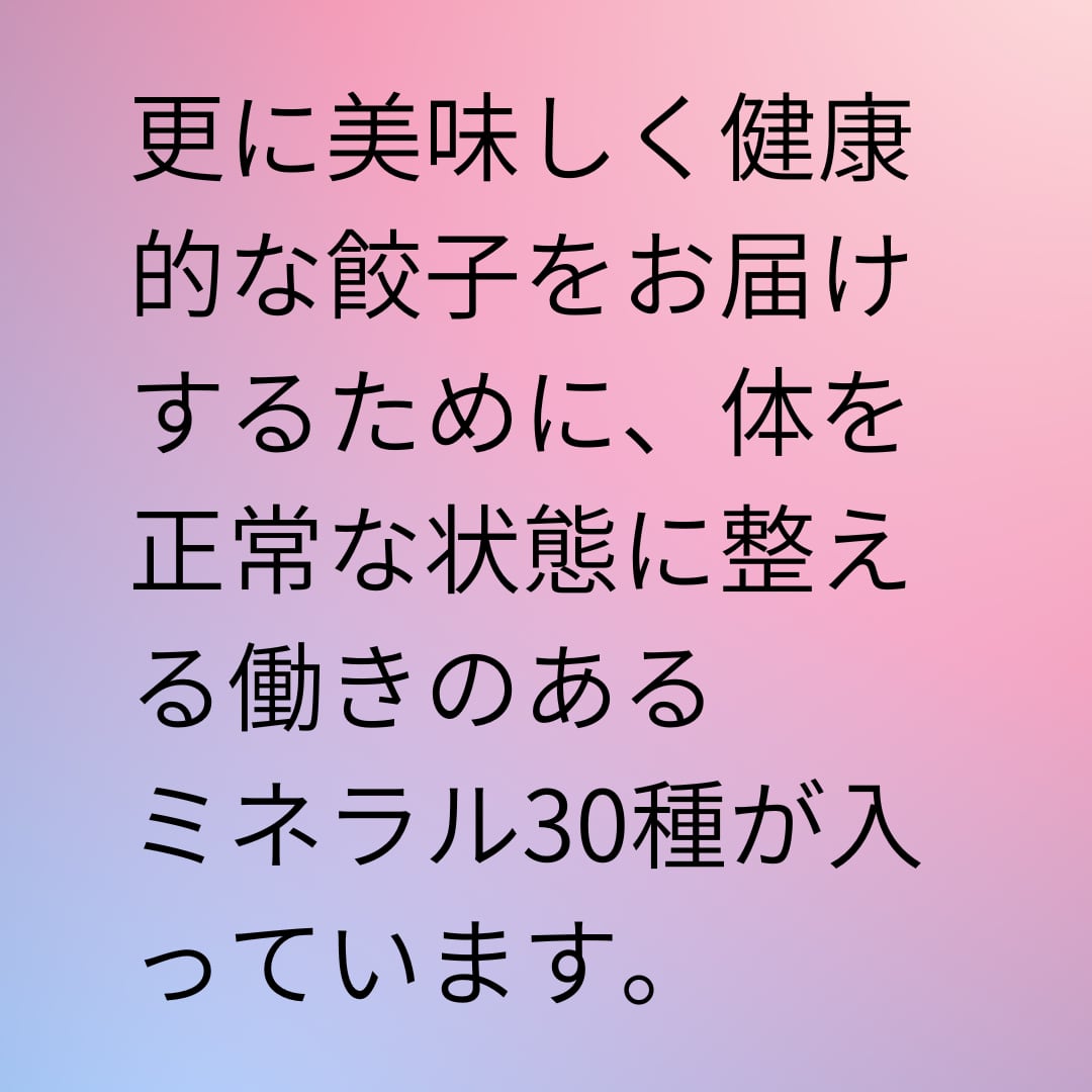 当店のすべての餃子には、体を正常に整える働きのあるミネラル30種が入っています。地元食材で美味しくて健康的な餃子をお届けします。